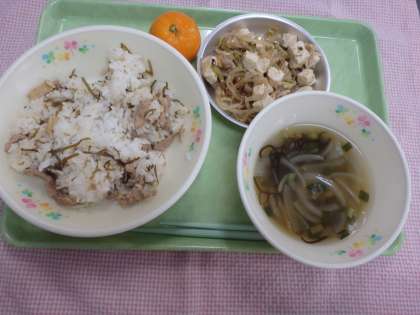 今日は沖縄料理。校長先生の元気応援メニューです。校長先生からのメッセージです・・・・「ゴーヤ」は沖縄県の代表的な野菜です。ちょっと苦いので、「苦瓜」とも言われます。ビタミンC、鉄分、食物繊維が豊富で栄養がたっぷりです。「チャンプルー」は沖縄の方言で「混ぜこぜ」という意味で、「炒め物」のことです。ゴーヤチャンプルーをたべて、夏の暑さに負けない体をつくりましょう。