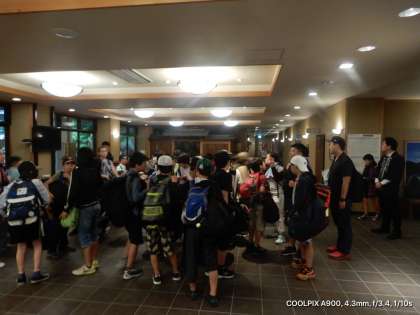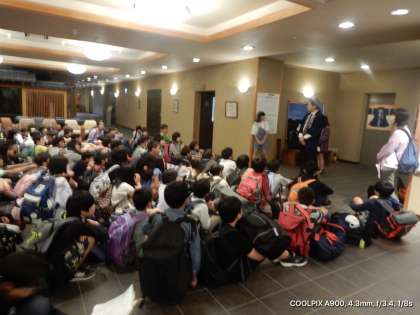 宿舎に到着。開校式を行いました。外は夕立ですが、すぐにやみそうです。