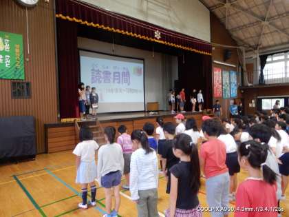 読書集会 公開日 2019/09/26 更新日 2019/09/26 今日の出来事 今朝の児童集会は、読書月間についてのお知らせでした。10月は、読書月間です。この機会に、たくさんの本を読んでほしいです。