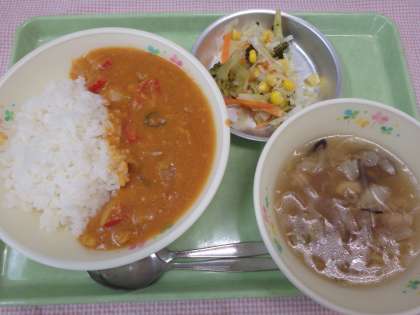 今日は、ラグビーワールドカップ開催にあわせ、日本の対戦国であるサモアの料理を食べます。カレモアの「カレ」はカレー、「モア」はとり肉で、カレー味のとり肉料理という意味です。サモアではごはんのほかに、ゆでたイモと一緒に食べることもあります。サパスイはにんにくが隠し味の、中華風春雨スープです。とても人気がある料理で、トンガなどサモアの近くの国でも同じような料理が食べられています。サモアの料理を食べて日本を応援しましょう!