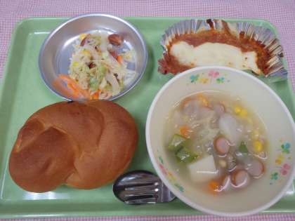 今日は、ラグビーワールドカップの開催にあわせ、日本の対戦国であるスコットランドの料理をたべます。シェパーズパイはマッシュポテトで作るパイ皮と、ひき肉をいためて具にしたミートパイです。牛肉や羊の肉を使って作りますが、給食では豚肉を使います。スコッチサラダは、スコットランドの代表的なスープです。肉や野菜、大麦など具をたくさんいれてコトコト煮込みます。そして、スコットランドでは、大みそかに「スコットランドバンズ」という、ドライフルーツやナッツをたくさん入れて焼いたパンをたべる風習があります。給食では、レーズンのたくさん入ったぶどうパンをたべましょう。
