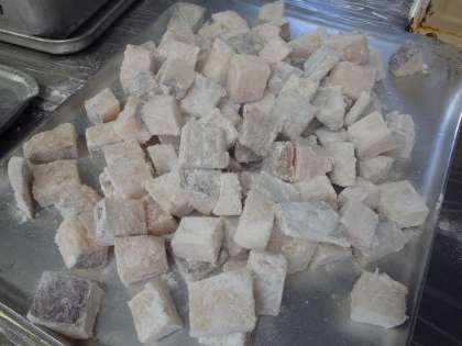 今日の魚はホキでした。米粉を薄くつけて高温でカリっと揚げた魚は、児童にも大人気でした。
