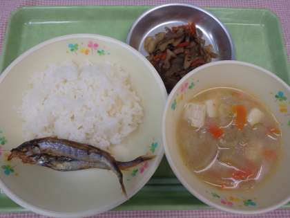 ごじるには、ミキサーでつぶした、大豆がたくさん入っています。大豆は「畑の肉」とも呼ばれ、栄養豊富で、体をつくったり、動かしたりする働きやおなかの調子を整える働きがあり、さらに、記憶力を高めるともいわれています。しっかり食べてくださいね。