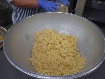 ごじるはいつもの味噌汁の材料につぶした豆を加えるといったシンプルな作り方ですが、児童に人気のあるメニューのひとつです。つぶすことでより豆の甘味が汁に出て、優しくこくのある味わいになります。