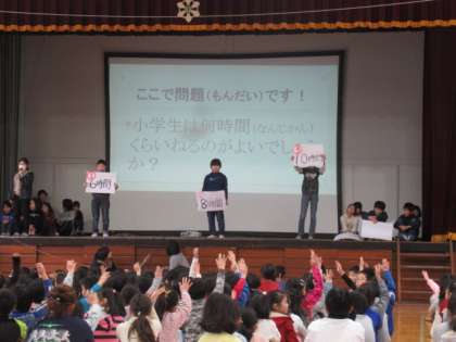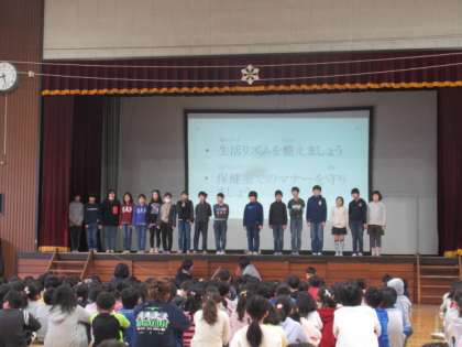 児童集会 公開日 2020/01/23 更新日 2020/01/23 今日の出来事 今朝の児童集会は、保健委員会による発表でした。睡眠・食事の大切さや保健室の利用の仕方などを動画やクイズで分かりやすく伝えてくれました。