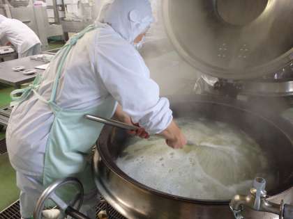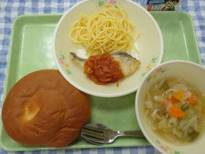ペペロンチーノはめんをゆでる時の塩分濃度がおいしさの鍵です。たっぷりの水に、1.0〜2.0%の食塩を加えてゆでると少し塩味のついたパスタになります。今日は調理員と相談しながら、ゆで水に対して1.5%の食塩を加えてゆでました。見た目は普通のパスタですが、食べるとびっくり!にんにくと唐辛子の香りで食欲がわきます!