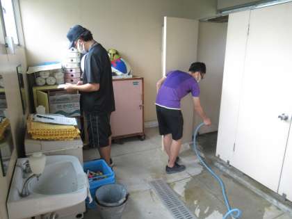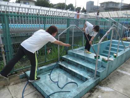 13日のプール開きに向け、職員で清掃、準備、ろ過機等の使用方法の確認を行いました。