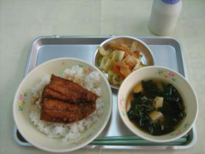 サンマの蒲焼どん 南蛮キャベツ きのこ汁 牛乳