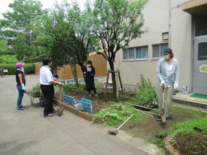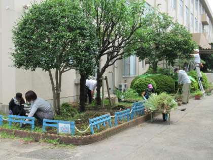 PTAの花壇にコスモス、オニユリ、グラジオラスを植えていただきました。