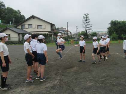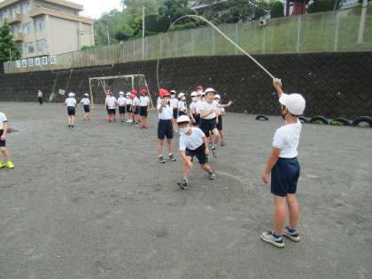校庭でクラスごとに長なわの8の字跳びに挑戦しました。