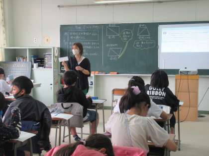 四角形に対角線をひき、できた三角形が合同かどうかを調べました。