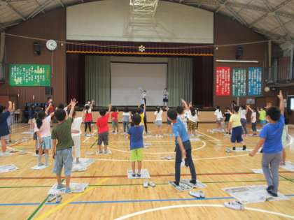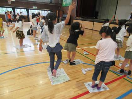 アクティブ委員会児童が2年生に向けて「新聞折りたたみじゃんけんゲーム」を実施しました。