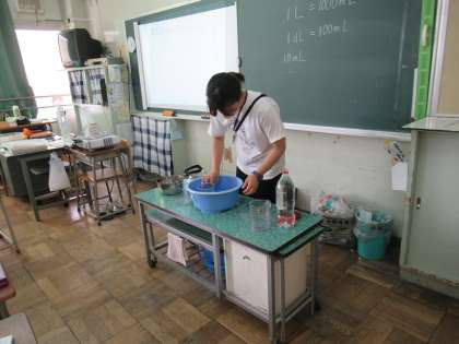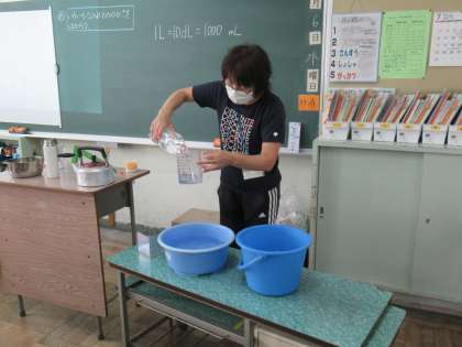 「かさ」の学習です。実際に水を使って量感をつかめるようにしました。