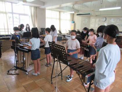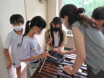 グループで分担し、1台の木琴を演奏します。タブレットで作成したリズムやタイミングを確認しながら練習しました。