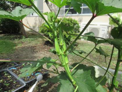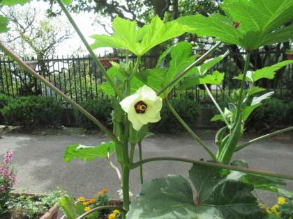 プランターで育てているオクラです。クリーム色の花を咲かせています。