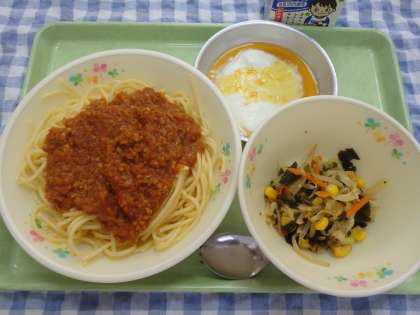 ミートソーススパゲティは今日も大人気でした。朝8時から3時間以上も煮詰め、うまみがぎゅっと凝縮されたミートソースは、給食でしか出せない味です。毎回、調理員は飛び散るミートソースと格闘し、エプロンも手袋もマスクも真っ赤になります。感謝の一言です!