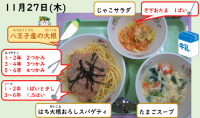 今日は「夕焼小焼やき」を作りました。夕焼けをイメージして、にんじんを使ったソースを魚にのせて焼いた料理です。八王子市のオリジナル給食です。