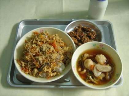 開花丼 つみれ汁 クルミ小女子 牛乳