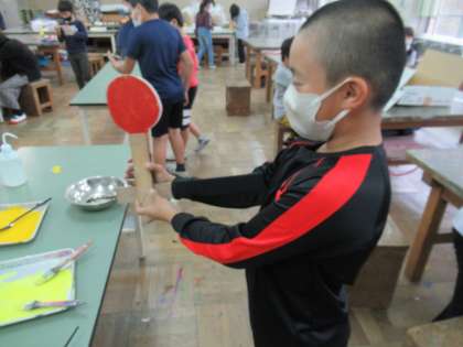 4年生 図工 公開日 2022/10/06 更新日 2022/10/06 今日の出来事 4年生が発明した作品です。「あごネクタイ」あごの下にべニア板で作ったネクタイを挟んでいます。「アシスト付き卓球ラケット」長い棒が腕(ひじ)まで伸びていて、ラケットを支えています。