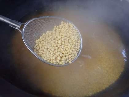 給食の大豆料理には国産の乾燥大豆を使います。料理ごとにゆで加減を変え、その料理に適したやわらかさに調整しています。うまみや栄養が溶け出したゆで汁も余さず使います。
