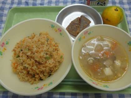 10月10日の目の愛護デーに合わせ、保健室の坂井先生の元気応援メニューを作りました。にんじんごはんのにんじんには、目の機能を助けるビタミンAが多く含まれています。