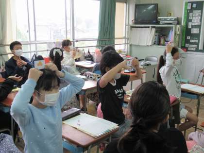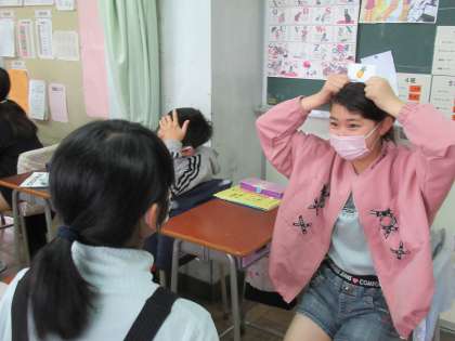 絵カードに描かれている食べ物について、英語で色、形、味、食感などを伝え、何の食べ物かを当てるゲームをしました。