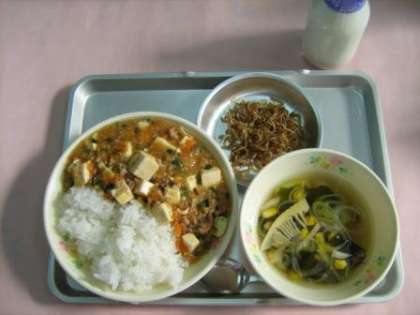 マーボー丼 わかめスープ 小魚の甘辛煮 牛乳