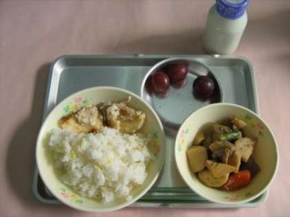 菊花ごはん 白身魚の味噌マヨネーズ焼き 筑前煮 ピヨーネ(1年3組さんがリクエストしてくれました) 牛乳