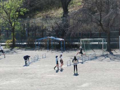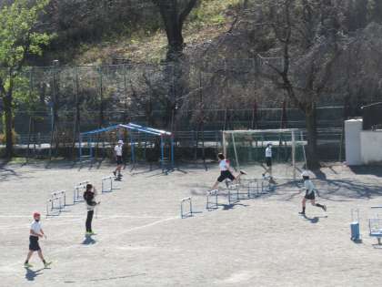 「ハードル走」の学習です。様々な歩幅で試してみて、自分に合うコースを決めて、記録をとります。