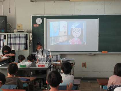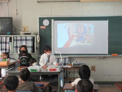 2学期のまとめをしました。「読み聞かせ係」の仕事を頑張った人たちが、憧れの図書ボランティアさんのように、読み聞かせをしました。