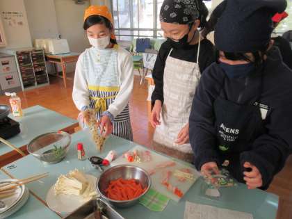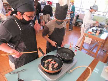 調理実習をしました。5種類(インゲン、ニンジン、エノキタケ、チーズ、お餅)のベーコン巻きを作りました。