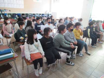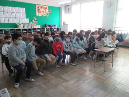 「明日へジャンプ」の学習です。めじろ保育園の年長さんとオンライン交流会をしました。