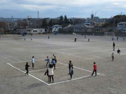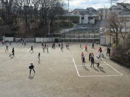 4年生が企画した遊びを3年生と一緒に行いました。2つの学年だけで校庭を広々使えます。