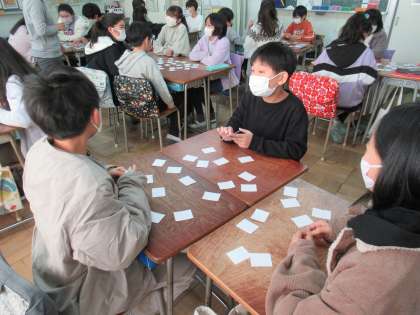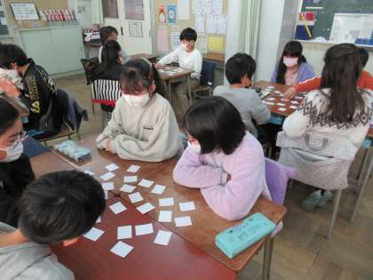 様々な場所が描かれた絵カードを使って、絵合わせ遊び(神経衰弱)をし、「場所」の英語表現を楽しく学びました。