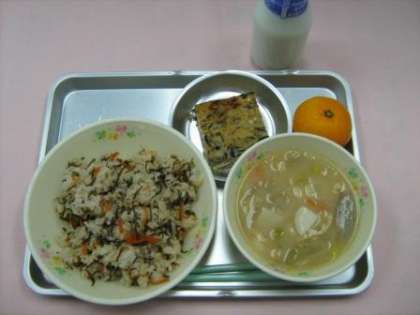 にんじんこんぶごはん ひじきいり卵焼き ご汁 みかん 牛乳