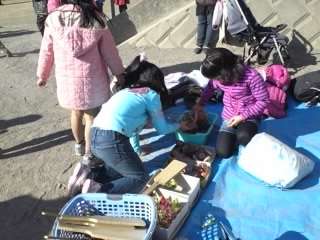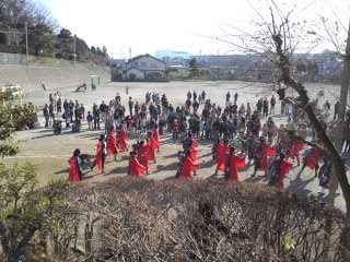 校庭では、どんど焼きの間に羽子板やコマ回しをして楽しむ子もいます。「学校の生活科でやったコマより大きくて、うまく回せないなー」。羽子はバトミントンとは容量が少し違うみたい・・・意外に難しい!?