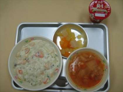 (今日の給食は、赤、緑、黄色、白・・・と色んな色の食材が使われています。色は、栄養の現れでもあります。たとえば、エビの赤はアスタキサンチン、とうもろこしの黄色はゼアキサンチンです。色んな色の食べ物を食べると、自然と栄養バランスも整う仕組みになっています。ただし、人工的な着色料には気をつけてください。)
