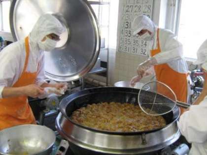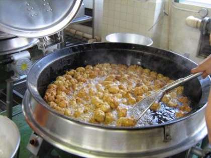 (沖縄ドーナツは、沖縄の言葉で、サーターアンダーギーと言います。「サーター」は砂糖、「アンダーギー」は揚げ物を意味します。その名の通り砂糖を多めに使用した球状の揚げドーナツです。今日は給食室で丸めて揚げました。)