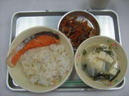 4月19日の給食 公開日 2012/04/19 更新日 2012/04/19 今日の出来事 五穀ごはん 鮭の塩焼き そぼろ金平 みそ汁 牛乳 (鮭は、生活習慣病の予防になるEPAやDHAがたくさん含まれています。これらは、血液をサラサラにして、流れをよくする働きがあります。)