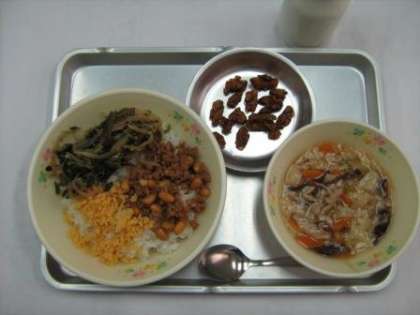 ビビンバは、韓国の料理で「ピビム」が混ぜる、「パプ」が「飯」の意味です。日本では、一般的に「ビビンバ」と呼ばれています。野菜もよく混ぜ、バランスよく食べましょう。