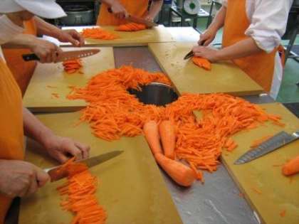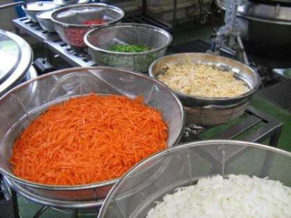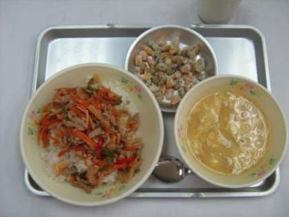 (チンジャオロース—とは、中国の料理でピーマンやたけのこ、肉、にんじんなどを千切りにして、オイスターソースで炒めた料理です。中華料理では有名ですね。千切りの食材は、歯ごたえがあっておいしいです。今日はすべての食材を調理員が包丁で千切りにしました。子どもたちも、美味しく食べてました。)