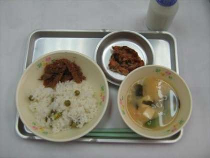 5月11日の給食 公開日 2012/05/14 更新日 2012/05/14 今日の出来事 グリンピースご飯 鶏肉の七味焼き 焼き海苔 花ごぼう みそ汁 牛乳 (グリンピースは今が旬です。グリンピースはエンドウマメが完熟する前の未熟な豆です。炭水化物をはじめ、カリウム、鉄、亜鉛、ビタミンB1、B2、などが豊富に含まれています。冷凍や缶詰で、年中たべられますが、生で食べられるのは、この時期だけです。今日は2年生のみなさんが、さやから剥いてくれたグリンピースを給食で使いました。
