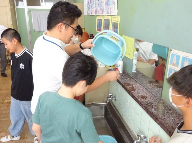 盛り上がったのは「ピッタリチャレンジ」。「手でぴったり1dlをすくおう」「バケツにぴったり3L入れよう」に挑戦。実際の量をLますやdlますで量る時は、のぞきこんで見ていました。