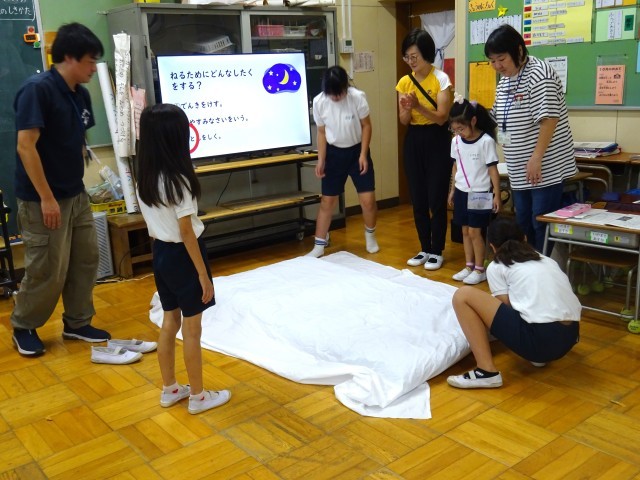 宿泊用しおりで行程を確認した後に、布団を敷いたり片づけたりする練習をしました。高尾山登山をするので、長い距離を歩く練習も予定しています。