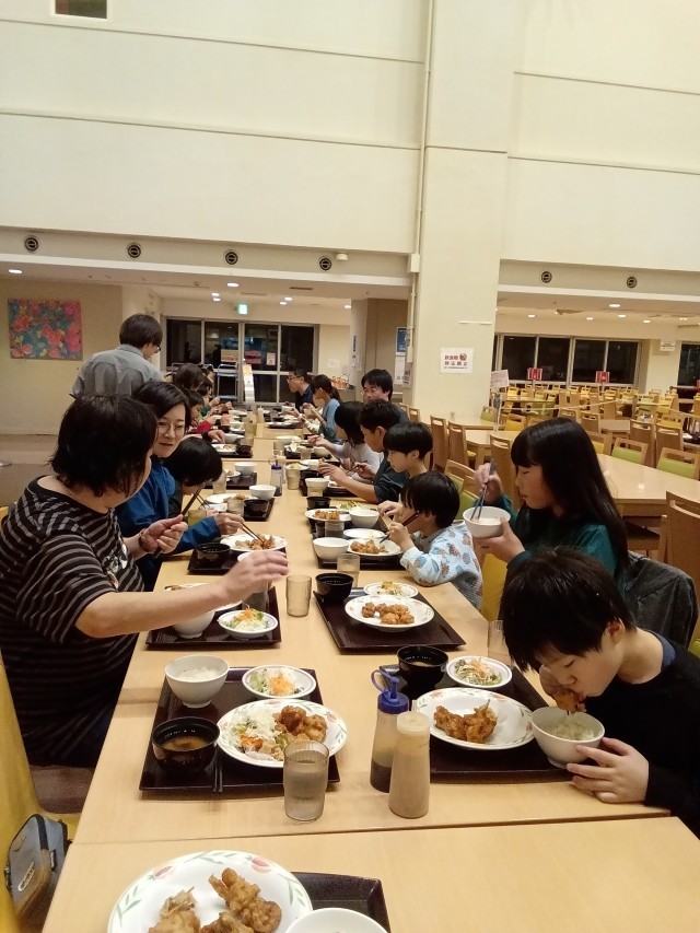 お腹ペコペコの子供たち、唐揚げセットをいただきました。このあとはキャンプファイヤーの予定です。