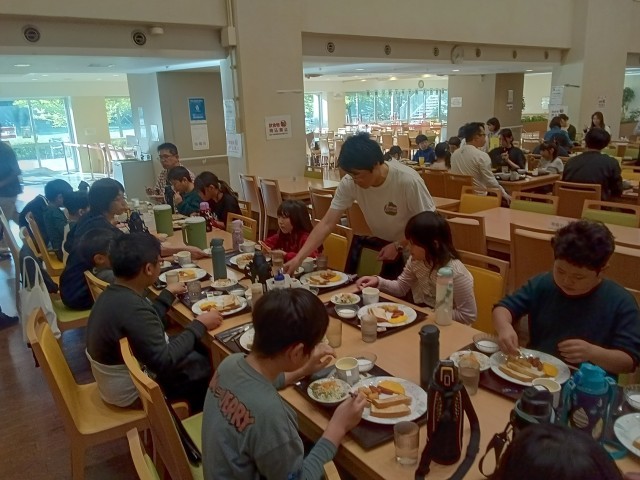 すっかり雨があがり、気持ちのいい天気になりました。今朝は宿舎の外で準備運動後、家族に宛て書いたハガキを投函するために散歩しました。お腹ペコペコになったところで朝食をいただきました。
