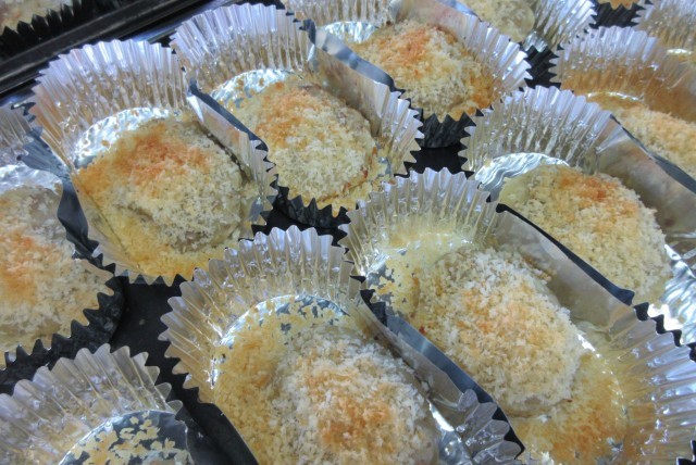 今日のコロッケは、油で揚げずに焼いています。玉ねぎ・ひき肉を炒め、じゃがいもを蒸してつぶしたものと混ぜ、小判型に成形します。アルミカップに入れ、パン粉とオリーブオイルを振りかけ、オーブンで焼きました。油で揚げたコロッケよりエネルギーがおさえられます。