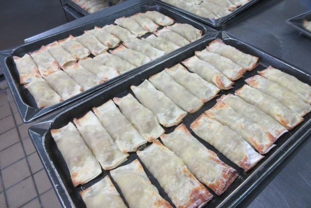 りんごとバター・砂糖を煮ておき、茹でたさつま芋とあえて種を作ります。それを餃子の皮に包み、油を塗って、オーブンで焼きました。皮はパリッと中はしっとりと仕上がりました。