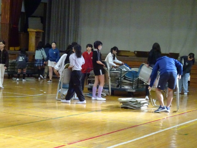 パイプ椅子をステージ下に入れたり、跳び箱やマットを所定の位置に並べたり、楽器を4階に運んだりと協力して行いました。人手が足りないところに率先して動いたり、気付くと手伝っていたりしていて、5年生の行動力と気遣いに感心しました。