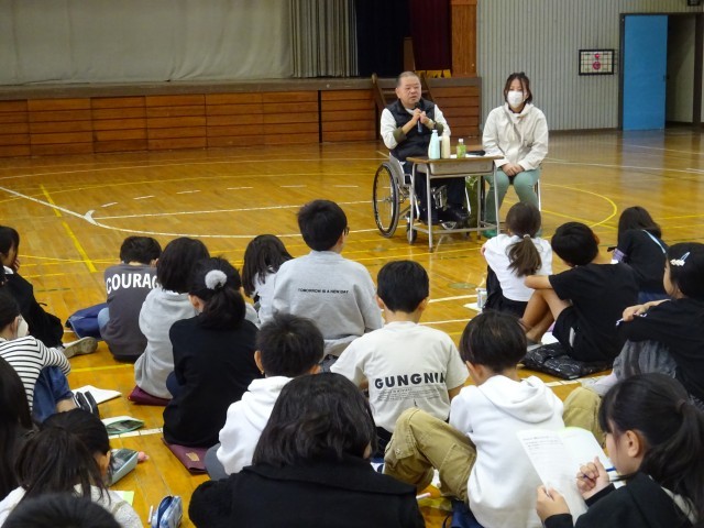 4年生は総合的な学習の時間に「福祉」を学んでいます。車いすユーザーの方をお招きしてお話を伺いました。